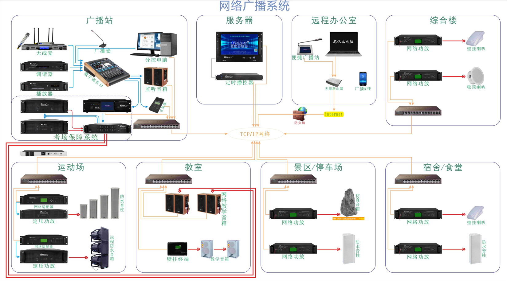 鉅峰網(wǎng)絡(luò)IP廣播系統(tǒng)是一套基于TCP/IP網(wǎng)絡(luò)的純數(shù)字化音頻廣播系統(tǒng)。鉅峰網(wǎng)絡(luò)IP廣播系統(tǒng)在物理結(jié)構(gòu)上與標準IP網(wǎng)絡(luò)完全融合,不僅真正實現(xiàn)基于TCP/IP網(wǎng)絡(luò)的數(shù)字化音頻的廣播、直播、點播,并借助TCP/IP網(wǎng)絡(luò)的優(yōu)勢,突破了傳統(tǒng)模擬廣播系統(tǒng)的內(nèi)容局限、空間局限和功能局限等。鉅峰網(wǎng)絡(luò)IP廣播系統(tǒng)不僅能夠完全取代傳統(tǒng)的模擬音頻廣播系統(tǒng)功能,更有傳統(tǒng)模擬廣播所沒有的自主交互式功能,為廣播在校園的應(yīng)用提供了更廣闊的空間。